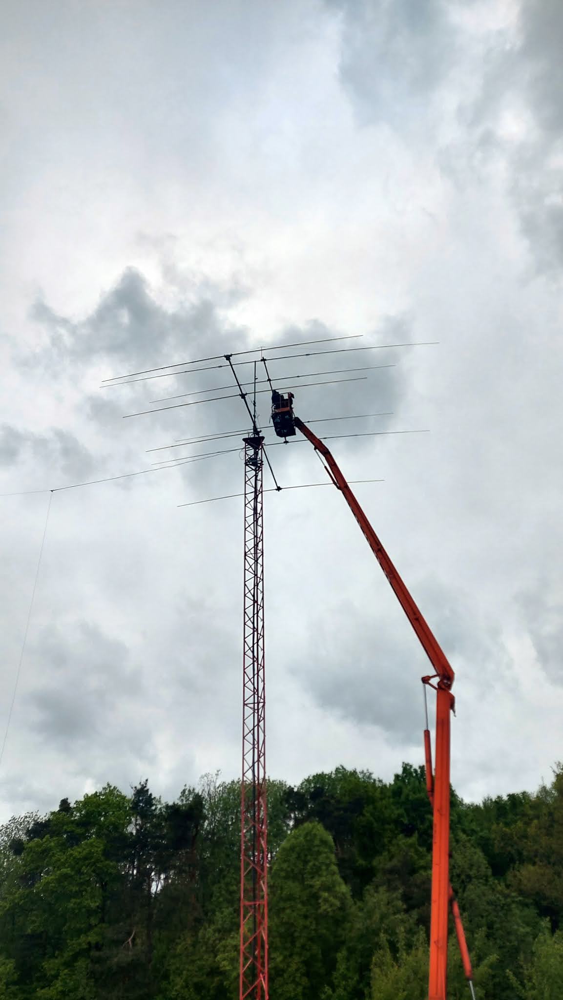 Předpověď na úterý 25.5. nevypadala moc dobře, ale technika byla objednána, tak nezbylo než doufat, že alespoň nebude pršet. Není to zde docela jednoduché sehnat plošinu s dostupem min 25m, za rozumný peníze a na celý den. Práce byly řádně naplánovány, materiál připraven, takže jakmile plošina přijela ihned se mohlo začít. Prvním úkolem bylo oprava šponování YAGI 40m. Zhruba za rok se šponovací lana protáhla tak, že rozsah napínáků už nestačil. A to jsou lana z materiálu Dyneema s minimální průtažností. Lana se tedy zkrátila a přidaly se další dva napínáky do série, tak by byla větší možnost došponování. Při zkracování je nutné boom podepřít, což zvládl Ruda bravurně pomocí plošiny a žebříku...